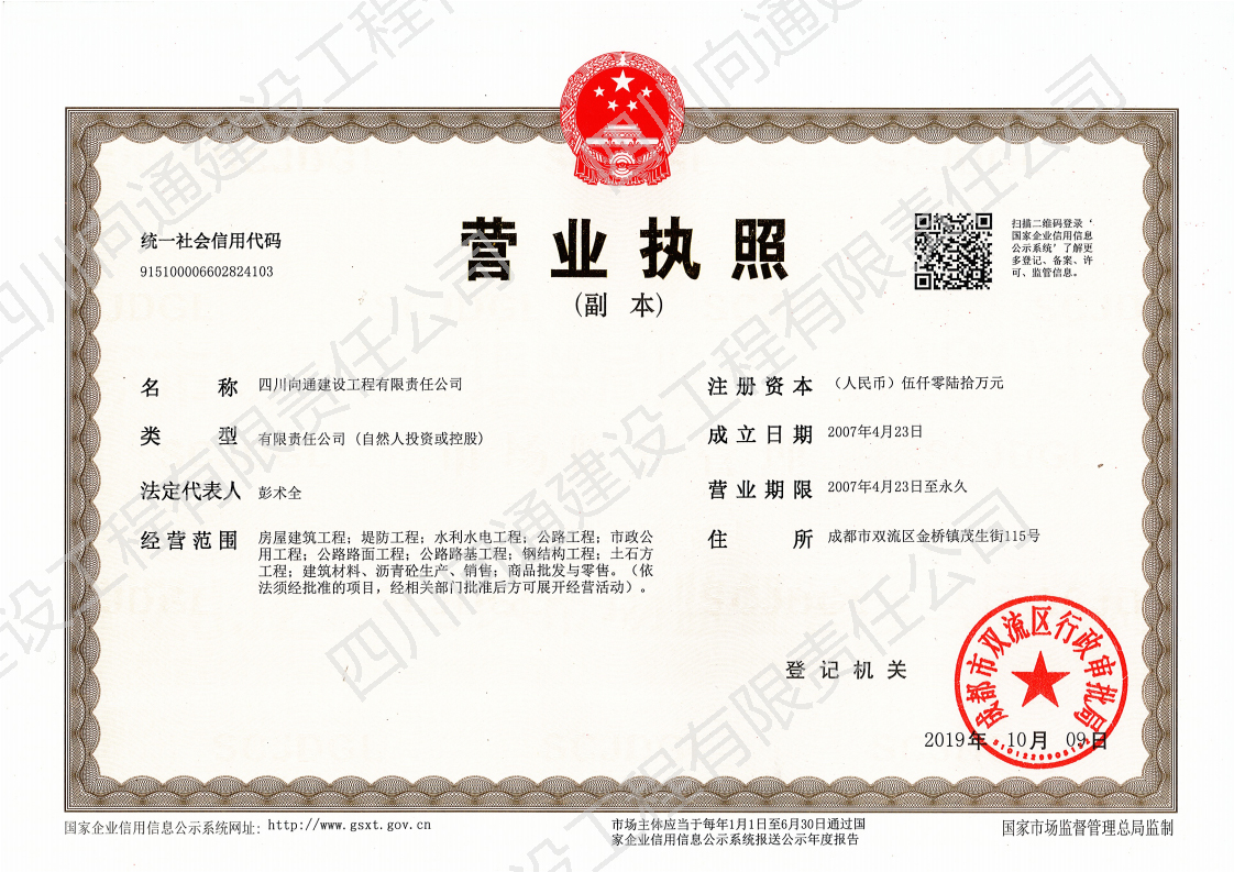 四川向通建設工程有限責任公司 四川向通建設工程有限責任公司成立于2007年,注冊資本金5060萬元,是一家專業從事瀝青混合料生產、專業分包以及市政道路、公路、路基工程專業施工建設的企業。公司注冊地址及生產廠區位于成都市雙流區金橋鎮茂生街115號,總占地面積約120畝;辦公地址位于雙流區海濱城海濱廣場7座11樓。公司生產廠區(雙流金橋)現有LB-5000型瀝青混合料拌合樓1套,每小時瀝青混合料生產量可達380噸。此外,根據項目需要,公司在多地建立4000型拌合站以服務施工(廣安齊福、達州、綿陽等),每小時瀝青混合料生產量為320噸。各種國內外道路施工機械:攤鋪機、壓路機、銑刨機、灑布車、封層車、吊車、拖車、等70余臺,可滿足各種道路施工需求。公司近100輛保溫運輸車輛均安設保溫板、加塞保溫棉、覆蓋棉絮和隔熱防水雨篷,有效減少瀝青混合料在運輸過程中的溫度流失進而保證瀝青路面的施工質量。 公司目前擁有眾多優秀的技術人才,成熟的市場渠道,良好的企業聲譽?,F有各專業施工人才共計79人;5支專業的施工班組可根據現場的具體情況制定實施性施工方案。今后公司將竭誠為各界客戶提供出色的產品和服務及具有競爭性的價格和具有創新精神的高效解決方案。 公司曾經榮獲:新津鄧雙段被新津縣政府評為“優良工程”;雙流宗申大道被雙流縣政府評為“優良工程”;成都后花園被成都市政府評為“重合同守信譽單位”;被三一重工評為“有遠見單位”。并在2018年1月被中國五冶集團評為“優秀供方”;同年3月被四川交投評為2017年度“優秀合作單位”的榮譽。榮譽的背后是我們公司所有員工堅持不懈的努力。 作為現代化的企業,公司將以技術為切入點,以信譽為支撐點,以市場為著眼點,促進管理創新和技術創新。因此我公司能在短時間內迅速發展成為一家擁有各類中大型施工機械設備的公司。在今后的工作中我們將借用現代電子信息溝通的便利為公司的發展助力,同時將秉承發揚以往的團結拼搏精神,推動公司成為“快穩型”發展的企業。 在未來的發展過程中,四川向通始終秉承“以質量求生存,以信譽求發展”的企業管理理念,以“啟后為先創佳績,爭做路建行業標”的企業宗旨與建設單位建立合作關系,創造更加輝煌燦爛的明天! 四 川 向 通 建 設